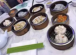 Dim sum (chinês tradicional: 點心, chinês simplificado: 点心, pinyin: diǎn xīné; jyutping: dim2 sam1) é uma ampla variedade de pequenos pratos cantoneses tradicionalmente apreciados em restaurantes durante o brunch.[1][2] A maioria dos pratos de dim sum modernos está associada à culinária cantonesa, embora pratos de dim sum também existam em outras culinárias chinesas. No século X, quando a cidade de Cantão (Guangzhou) começou a experimentar um aumento nas viagens comerciais,[3] muitas pessoas frequentavam casas de chá para refeições pequenas com chá, chamadas de "yum cha" ("brunch").[3][4][5]Yum cha inclui dois conceitos relacionados.[6] O primeiro é "jat zung loeng gin" (chinês: 一盅兩件), que se traduz literalmente como "uma xícara, dois itens". Isso se refere ao costume de servir aos clientes da casa de chá dois itens alimentares, salgados ou doces, para complementar o chá. O segundo é o dim sum, que se traduz literalmente como "tocar o coração", o termo usado para designar os pequenos alimentos que acompanhavam o chá.
