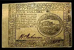 Após o começo da Guerra da Independência em 1775, o Congresso Continental iniciou a impressão de notas conhecidas como dinheiro continental ou "continentais" (Continentals). As notas continentais eram em dólares e iam de 1/6 de dólar a 80 dólares, incluindo muitas variações. Durante a Revolução, o Congresso imprimiu 241.552.780 em Dinheiro Continental [10].