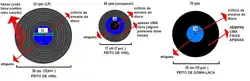 No início, as muitas companhias existentes estabeleceram diversas velocidades de reprodução e dimensão do disco: existiam modelos que variavam entre 15, 17, 20, 25 e 30 cm de diâmetro; e que eram reproduzidos em velocidades que variavam de 60 a 120 rpm. Foi apenas no final da primeira década do século XX que o padrão de discos de 25 cm revolucionando entre 76 e 80 rpm foi adotado (ainda continuaram a ser editados discos de dimensões maiores, de 30 cm, especialmente para peças de música clássica, de maior duração).[12]