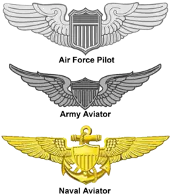Os primeiros Distintivos de Aviador dos Estados Unidos foram emitidos para membros do Serviço Aéreo durante a Primeira Guerra Mundial . As insígnias foram emitidas em três graus: Observer (um escudo "EUA" e uma asa do lado esquerdo), Aviador Júnior ou Oficial de Aviação da Reserva (um escudo "EUA" entre duas asas) e Aviador Sênior (uma estrela sobre "EUA" escudo entre duas asas). O Serviço Aéreo do Exército também emitiu um crachá para pilotos de balão, conhecido como Crachá de Aeronauta .