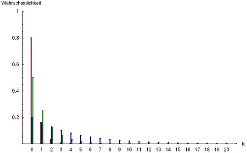 - a distribuição de probabilidade do número Y = X − 1 de insucessos antes do primeiro sucesso, suportadas pelo conjunto { 0, 1, 2, 3, ... }.