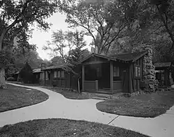 - Cabanas Ocidentais Também conhecidas como "Deluxe Cabins", as cabanas duplex e quadruplex são construídas de forma substancial com enormes pilares de pedra e lareiras e tetos de treliça de toras abertas. As paredes de enchimento são construídas no estilo "pregos para fora". Essas cabanas foram construídas a partir de 1927.[2]