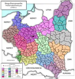 A divisão administrativa da Segunda República da Polônia ocorreu logo após a Polônia recuperar sua independência como conseqüência do término da Primeira Guerra Mundial, em 1918. A Polônia havia sido particionada ainda no final do século XVIII, e várias partes do novo território polonês possuíam estruturas administrativas diferentes por terem pertencido anteriormente a formas diferenciadas de administração (Império Austríaco, Alemanha Imperial e Império Russo). Em 1919 foram criadas as primeiras voivodias polonesas do entre-guerras, além disso, a capital Varsóvia tinha a qualidade de cidade independente e ao mesmo tempo voivodia. Nos anos 1919-1921 foram criadas novas voivodias, uma vez que as novas fronteiras da Polônia não estavam ainda consolidadas, com eventos como a Revolta da Silésia, no oeste e a Guerra polaco-soviética, a leste, posteriormente, em 1921 a Polônia teria 15 voivodias, Varsóvia, a capital, uma cidade-voivodia e a voivodia Autônoma da Silésia (o sistema conhecido como 15+1+1). O nível inferior de administração, logo abaixo das voivodias, era os powiaty. Eles foram objeto de várias reformas, sobretudo no início e final da década de 1930. Abaixo deles estavam as gminy e as gromady. Pouco antes da Segunda Guerra Mundial, em abril de 1939, a Polônia tinha 264 powiaty, 611 gminy urbanas e 3.195 rurais e 40.533 gromady.