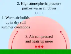 Em condições secas e constantes de verão, uma massa de ar quente se forma. A alta pressão da atmosfera terrestre empurra o ar quente para baixo. À medida que o ar quente tenta subir, a alta pressão atmosférica o força para baixo, o que o faz ficar ainda mais quente e mais denso. À medida que o ar é comprimido, ele fica ainda mais quente. A alta pressão atua como uma cúpula, fazendo com que tudo fique cada vez mais quente.[6]
