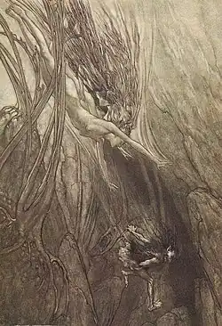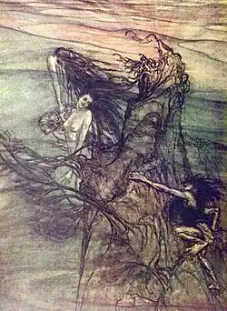 - ↑ A quantidade de seres em Nibelungenlied não é especificada. Duas são nomeadas, mas o texto também sugere a existência de uma terceira.