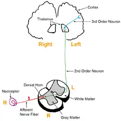Numa pessoa saudável, a medula espinhal tem uma função inibitória ou de filtro que actua contra a condução destes estímulos. Porém se houver lesão dos nervos esta função deixa de funcionar com fiabilidade. O efeito inibitório de certos tractos nervosos deixam de estar intactos e as fibras A e C podem bombardear o cérebro com sensações desagradáveis e dolorosas. A consequência é um fluxo de informação cansativo e quase contínuo.