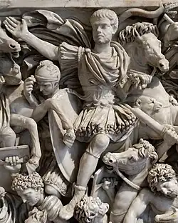 Arriano afirma que estandartes coloridos oferecem prazer e assombro visual, mas também ajudam os cavaleiros a se posicionarem corretamente nos complicados treinos.[7] No século V, o poeta latino galo-romano Sidônio oferece um descrição similar, senão mais roxeada,[8][9] enquanto no século IV, o historiador Amiano Marcelino faz um relato da procissão de chegada de Constâncio II (r. 337–361) a Roma em 357: