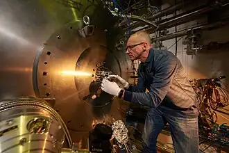 O coordenador técnico do E.A.g.I.E., Stefan Haider, em frente ao aparelho principal. A parte removida é chamada de “Sol” entre os colegas, pois possui vários instrumentos saindo do flange circular central.