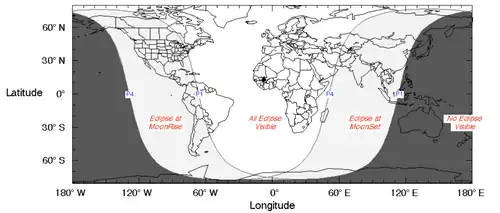 ![]() Região do planeta onde foi visível durante o máximo do eclipse - 0:44 UTC. O noroeste da África, na região do Saara, obteve melhor observação do evento, ocorrido à meia-noite. |