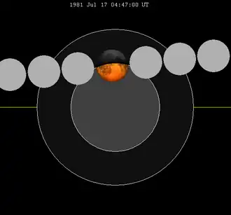 - ↑ F. Espenak. «Partial Lunar Eclipse of 1981 July 17» (PDF). NASA Eclipse Website. Consultado em 13 de agosto de 2017