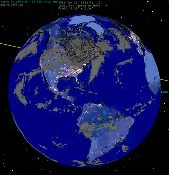 ![]() Simulação da Terra vista da Lua durante o máximo da totalidade - 5:12 UTC. Cuba e Jamaica obtiveram a melhor observação do meio do eclipse, de onde foi visível à meia-noite. |