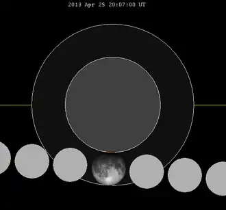 - ↑ F. Espenak. «Partial Lunar Eclipse of 2013 April 25» (PDF). NASA Eclipse Website. Consultado em 10 de agosto de 2017