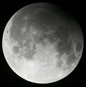 ![]() A Lua cruzando a borda sul do cone de sombra da Terra, de oeste para leste (da direita para a esquerda), com apenas a extremidade norte da Lua obscurecida. | |