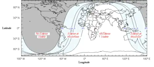 ![]() Região do planeta onde foi visível durante o máximo do eclipse - 20:07 UTC. A região central do Oceano Índico obteve a melhor observação do meio do eclipse, de onde foi visível à meia-noite. |