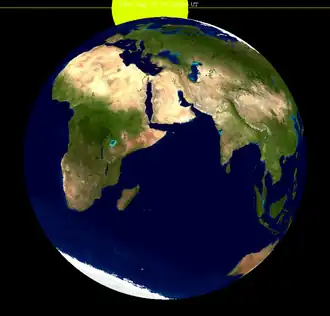 Região do planeta onde foi visível durante o máximo do eclipse - 20:09 UTC. O Oceano Índico, obteve a melhor observação do meio do eclipse, de onde foi visível à meia-noite.