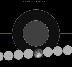 - ↑ F. Espenak (7 de junho de 2011). «Penumbral Lunar Eclipse of 2012 Nov 28» (PDF) (em inglês). NASA Eclipse Website. Consultado em 23 de dezembro de 2011