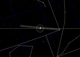 ![]() O trajeto da Lua ao longo do cone de sombra, em nodo ascendente, na constelação de Áries. | |