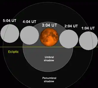 ![]() A Lua cruzando a metade norte do cone de sombra da Terra, de oeste para leste (da direita para a esquerda), com o disco lunar avermelhado durante a totalidade. | |