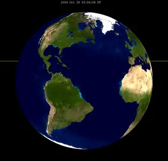 ![]() Simulação da Terra vista da Lua durante o máximo da totalidade - 3:04 UTC. A região do Oceano Atlântico à leste da Jamaica e ao norte das Guianas (na América do Sul), obteve a melhor observação do meio do eclipse, de onde foi visível à meia-noite. |