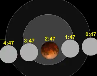 ![]() A Lua cruzando dentro da região sul do cone de sombra da Terra, de oeste para leste (da direita para a esquerda), com o disco lunar avermelhado durante a totalidade. | |