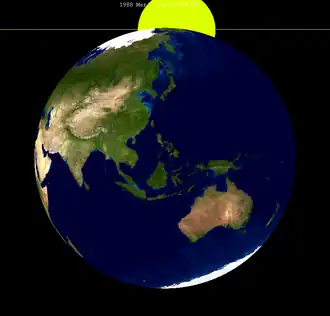 Foi visível sobre a Ásia, Austrália, Nova Zelândia, Oceano Índico, grande parte da África, Europa e do Pacífico, e na faixa oeste do Canadá e Estados Unidos, na América do Norte.
