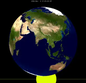 ![]() Região do planeta onde foi visível durante o máximo do eclipse - 17:55 UTC. O litoral leste da Índia, no Oceano Índico, obteve a melhor observação do meio do eclipse, de onde foi visível à meia-noite. |
