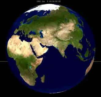 ![]() Região do planeta onde o eclipse foi visível durante o máximo da totalidade - 19:56 UTC. As regiões do Oriente Médio é do Oceano Índico obtiveram a melhor observação do meio do eclipse, de onde foi visível à meia-noite. |