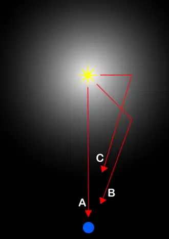 Na ilustração da direita, a luz que avança pelo caminho A é emitida pela fonte original e chega ao observador primeiro, à luz que segue o caminho B é, às vezes, refletida por nuvens de gases que se encontra em um ponto entre a fonte e o observador; e a luz que percorre o caminho C é refletida, às vezes, também por nuvens de gases perpendiculares ao caminho direto. Embora que para o observador da luz que percorre os caminhos B e C parecem vir do mesmo ponto, B em realidade se pensa que é muito mais próximo. Como resultado, o observador acredita que o eco se expande a uma velocidade maior que a da luz.