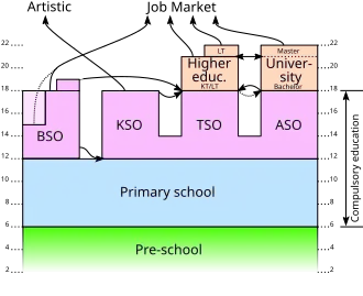 - Educação secundária artística (em neerlandês: Kunstsecundair onderwijs; KSO; em francês: Enseignement Secondaire artistique. Cerca de 2% de todos os alunos.): Essas escolas ligam a educação secundária geral com uma prática artística ativa, variando de performance a apresentação. Dependendo da direção, vários assuntos podem ser apenas teóricos, preparando para uma educação superior. Direções incluem dança (escola de balé), atuação, e várias artes gráficas e musicais. Muitos alunos graduados dessas escolas vão para conservatórios musicais, escola superior de atuação ou balé, ou colégios de arte para desenvolver mais a sua arte.