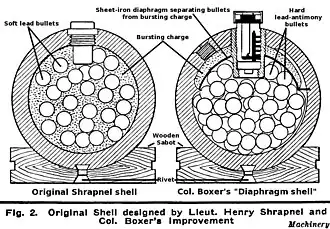 Na "granada Shrapnel" original, as bolas de metal estavam embutidas nos explosivos. Em alguns casos, isso fzia com que a munição explodisse prematuramente, pois o atrito poderia surgir entre as bolas de metal no momento do disparo. A ideia de Boxer era separar os explosivos das bolas de metal com uma divisória (diafragma). Os explosivos não ficavam no centro, mas de um lado, para distribuir as bolas de metal da maneira mais uniforme possível. Para a liberação da carga, o estojo da munição tinha pontos de quebra pré-determinados.[20]
