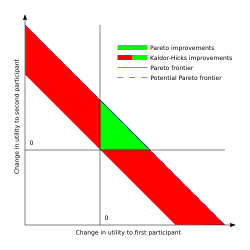 Usando o critério para a melhoria de Kaldor-Hicks, um resultado é uma melhoria se aqueles que ficam melhor podem em princípio compensar aqueles que ficam pior, de modo que uma melhoria segundo Pareto poderia (embora não necessariamente) ser alcançada. Por exemplo, uma transação voluntária que cria poluição seria uma melhoria de Kaldor-Hicks se os compradores e os vendedores estivessem ainda dispostos a efetivar a transação mesmo se tivessem que compensar totalmente as vítimas da poluição. A Kaldor-Hicks não exige que a indenização seja de fato paga, apenas que a possibilidade de compensação existe e, portanto, não exige que todos fiquem melhor. Segundo a eficiência de Kaldor-Hicks, uma melhoria pode de fato deixar algumas pessoas pior. As melhorias segundo Pareto exigem que todas as partes envolvidas fiquem melhor (ou pelo menos nenhuma fique pior).