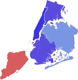 | Resultados da eleição por borough Adams: 50–60% 70–80% 80–90% Sliwa: 60–70% | ||||