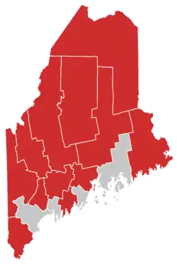 | Resultado da votação por condados: em vermelho onde LePage obteve maior votação, e em cinza onde Cutler obteve maior votação. | |||||||||