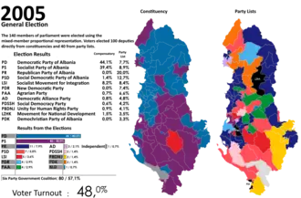 Liderado pelo ex-presidente Sali Berisha, o Partido Democrático da Albânia (PDSh), principal partido de oposição ao governo socialista de Fatos Nano, sagrou-se vencedor do pleito ao conquistar 40% dos votos válidos, elegendo uma maioria relativa de 56 deputados.[1]