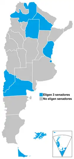O Senado, segundo o art. 54 da Constituição Nacional, é composto por três senadores de cada província e três da cidade de Buenos Aires.[22] Dois dos senadores devem corresponder à força política com maior número de votos e um dos senadores deve corresponder à com o segundo maior número. Os mandatos dos senadores duram seis anos, também com a possibilidade de reeleição ilimitada.[23] Para ser senador, deve-se ter mais de 30 anos.[24]