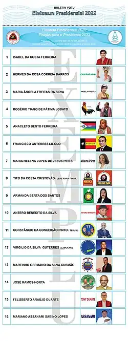 - ↑ a b c d e f g h i j k l m n o p Dile Payong, Stefanus (2 de março de 2022). «Kampanye Pilpres Timor Leste Dimulai Hari Ini, 16 Capres Siap Bertanding». belu.inews.id/ (em indonésio). Consultado em 4 de março de 2022