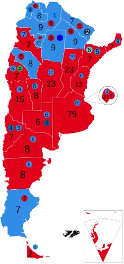 | Santiago del Estero | 18 | 109.012 | 40,57 | 8 | 130.411 | 48,53 | 9 | 1.146 | 0,43 | – | 1.106 | 0,41 | – | 27.030 | 10,06 | 1[nota 7] | 8.794 | 3,17 | 277.499 | 69,89 |