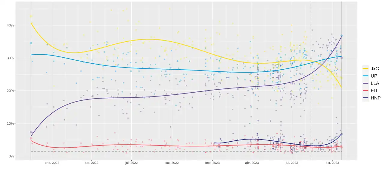 Nos resultados do primeiro turno, o candidato governista da União pela Pátria (UP), Sérgio Massa, acabou de forma inesperada ficando em primeiro lugar com 36% dos votos, seguido pelo segundo colocado do Liberdade Avança, Javier Milei, que obteve quase 30% dos votos.[8] O resultado foi considerado uma surpresa, visto que a inflação estava quase aos 140% durante a gestão de Massa como ministro da Economia,[9] mas por outro lado, seu afastamento com o kirchnerismo e admissão da má gestão econômica do país poderiam ser alguns dos fatores que contribuíram para seu ganho de votos no primeiro turno.[10][11] No segundo turno, outros oponentes de Massa e anti-peronistas, como Patricia Bullrich e Mauricio Macri, declararam apoio a Milei.[12] Após a apuração dos votos, Javier Milei foi eleito com 55% do eleitorado, superando os 44% dos votos de Sergio Massa.[13]