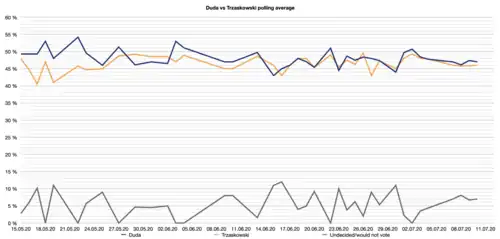 Com quase a totalidade dos votos apurados, a Comissão Eleitoral confirmou a realização de um segundo turno com Duda e Trzaskowski. Enquanto o presidente obteve 43,5%, Trzaskowski alcançou 30,3%.[28] Durante o segundo turno, as pesquisas de opinião indicaram proximidade entre ambos os candidatos. As pesquisas boca de urna deram uma pequena vantagem para Duda, sem contudo ser possível determinar o desfecho da eleição.[29][30] Duda declarou vitória, mas Trzaskowski afirmou que estava confiante de sua vitória quando os resultados fossem divulgados.[31] No dia seguinte, em 13 de julho, a Comissão Eleitoral confirmou a reeleição de Duda, com 51% dos votos;[32] Trzaskowski reconheceu a derrota logo depois.[33]