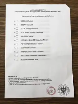 - ↑ «Wybory Prezydenta Rzeczypospolitej Polskiej w 2020 r.». prezydent20200628.pkw.gov.pl (em polaco). Consultado em 26 de fevereiro de 2023