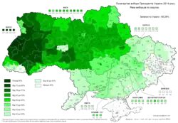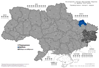 As eleições não foram realizadas em toda a Ucrânia. Durante a crise da Crimeia de 2014 , a Ucrânia perdeu o controle sobre a Crimeia , que foi anexada unilateralmente pela Rússia em março de 2014[4]. Como resultado, não foram realizadas eleições na Crimeia. Em Donbass, apenas 20% das urnas estavam abertas devido a ameaças e violência de separatistas pró-Rússia.[5]