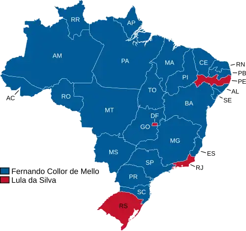 | Estado[12] | Eleitorado | Abstenção | % | Collor | % | Lula | % | Votos brancos | % | Votos nulos | % |