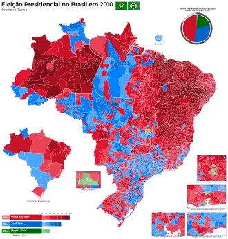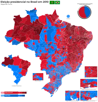 ![]() Candidato mais votado por unidades federativas e municípios, incluindo as zonas eleitorais das quatros principais regiões metropolitanas e do Distrito Federal no 1.º turno. ![]() Candidato mais votado por unidades federativas e municípios, incluindo as zonas eleitorais das quatros principais regiões metropolitanas e do Distrito Federal no 2.º turno. | ||||||||||||||||||||||