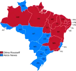 - ↑ a b c d e «Resultados - 2º turno presidencial 2014». Folha de S.Paulo. 26 de outubro de 2014. Consultado em 14 de fevereiro de 2018. Cópia arquivada em 6 de dezembro de 2017