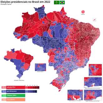 A eleição presidencial de 2022 foi a edição mais acirrada da história do Brasil. Lula da Silva saiu da eleição como o presidente mais votado da história do Brasil,[48] ainda assim, a quantidade dos votos nulos e brancos (5,7 milhões) foi maior que a diferença de votos entre os dois candidatos (2,1 milhões).[49] Foi também a primeira vez desde a redemocratização que o candidato derrotado, Jair Bolsonaro, ganhou em mais unidades federativas que o candidato vencedor, Luiz Inácio Lula da Silva.[50][51]