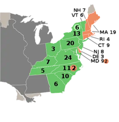Cada "eleitor" é nomeado pelo legislativo estadual. Connecticut, Delaware, Geórgia, Massachusetts, Nova Iorque, Carolina do Sul, Vermont.