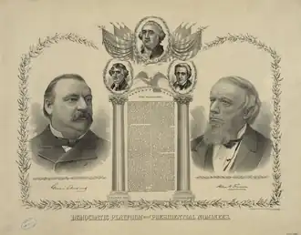 A Convenção Nacional Democrata foi realizada em St. Louis entre 5 e 7 de junho.[5] O atual presidente Grover Cleveland foi renomeado candidato presidencial por unanimidade, sem uma votação formal. Esta foi a primeira vez que um presidente em exercício Democrata havia sido renomeado desde Martin Van Buren em 1840. Depois de Cleveland ser renomeado, os democratas tiveram que escolher um substituto para Thomas A. Hendricks. Hendricks concorreu sem sucesso como o candidato democrata a vice-presidente em 1876, mas ganhou o ofício quando ele correu novamente com Cleveland em 1884. Hendricks serviu como vice-presidente por apenas oito meses antes de morrer no cargo em 25 de novembro de 1885. O ex-senador Allen G. Thurman foi indicado para vice-presidente sobre Isaac P. Gray, seu rival mais próximo, e John C. Black, que arrastou para trás. Gray perdeu a nomeação para Thurman principalmente porque seus inimigos tinham trazido suas ações enquanto era um Republicano.[6] A plataforma democrata em grande parte limitou-se a uma defesa da administração Cleveland, apoio à redução da tarifa e impostos em geral, bem como a condição de estado para os territórios do oeste.