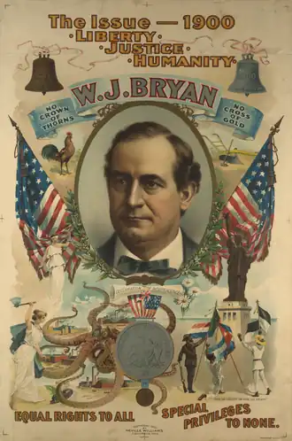 A campanha de Bryan foi uma reprise de seu grande problema da campanha de 1896, a prata-livre. Não foi tão bem sucedido em 1900 por causa da melhoria da economia e um aumento da oferta de ouro causada pela produção de novos no Alasca e na África do Sul que permitiu que mais dólares de papel pudessem entrar na economia nacional. Na campanha de Bryan, ele atacou McKinley por imperialismo; Bryan argumentou que em vez de Cuba e as Filipinas estarem livres, a administração de McKinley havia simplesmente substituído uma tirania cruel espanhol com um americano um cruel. Bryan foi especialmente duro em suas críticas do esforço militar americano para reprimir uma rebelião sangrenta por guerrilheiros filipinos. Este tema ganhou mais alguns adversários anteriores.