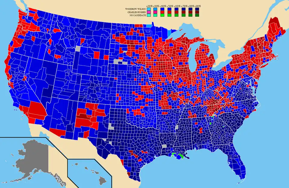 A eleição ocorreu quando a Europa estava mergulhada na Primeira Guerra Mundial. O sentimento público, ainda neutro, os Estados Unidos se inclinou para seus aliados, as forças britânicas e francesas, devido ao tratamento áspero de civis pelo exército alemão, que tinha invadido e ocupado grande parte da Bélgica e o norte da França. No entanto, apesar de sua simpatia para com as forças aliadas, a maioria dos eleitores americanos queriam evitar o envolvimento na guerra, e preferiram prosseguir numa política de neutralidade. Depois de uma disputa árdua, Wilson derrotou Hughes por uma margem estreita. Wilson foi ajudado por seu slogan de campanha "Ele nos manteve fora da guerra".