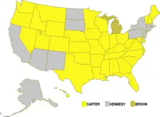 Carter venceu apenas na Geórgia (seu estado natal), Maryland, Minnesota (estado natal de Mondale), Havaí, Virgínia Ocidental, Rhode Island e o Distrito de Colúmbia.